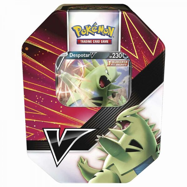 Was ist dein Kampfstil? Die Zeit der gewaltigen Kampfstile ist da- mit neuen Pokémon, die hard und oft zuschlagen, wie diese 2 monströsen Chaosstifter! Wähle die krachende Power von Despotar-V oder die schnellen eisigen Attacken von Impoleon-V in der Pokémon-Sammelkartenspiel-Tin-Box V-Kämpfer. Jede dieser fantastischen Tin-Boxen enthält ein supermächtiges Pokémon-V mit unglaublichen Attacken und Fähigkeiten, die dich bei deinem nächsten Pokémon-Kampf bis nach ganz oben bringen werden!